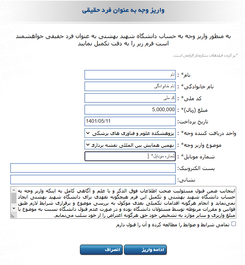 خواهشمند است هنگام وارد کردن مبلغ واریزی دقت لازم را به عمل آورید زیرا دبیرخانه همایش هیچگونه مسئولیتی در قبال خطا در واریز وجه ندارد.